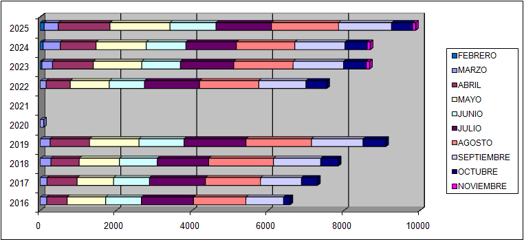La distribución de estos peregrinos sería, según los meses de apertura del Albergue la mostrada en el gráfico, donde se puede apreciar claramente el aumento cuantitativo en el número de peregrinos a lo largo de los años, así como una mayor afluencia en los meses de agosto, julio y septiembre.