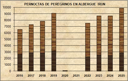 Durante el Año Santo Jacobeo 2004, primero de vida de éste nuestro, vuestro, albergue pernoctaron en sus dependencias un total de 501 peregrinos. El número de peregrinos en el año 2005 ascendió a 919; en 2006 la cifra siguió aumentando hasta 1613 peregrinos; en 2007 aumentó hasta 1765, en 2008 la cifra aumentó hasta llegar a 2680 peregrinos, en 2009 pernoctaron en el albergue de Irun 2940 peregrinos. Es normal que en el Año Santo Jacobeo 2010 la cifra de pernoctas subió hasta 3624 peregrinos, pero en los años siguientes la cifra continuó en aumento, así, en 2011 pernoctaron 3983 peregrinos, en 2012 pernoctaron 4274 personas, en el año 2013 pernoctaron 4770 peregrinos, en 2014 durmieron 5414 peregrinos, en 2015 fueron 6296, en 2017 fueron 7305, en 2018 fueron 7851 y en 2019 alcanzamos el tope máximo con 9104 peregrinos. En el año 2020, con la llegada de la pandemia Covid-19, solamente abrimos en marzo y pernoctaron 91 peregrinos, en el año 2021 el albergue permaneció cerrado durante todo el año. El año 2022 la situación vuelve a estabilizarse y pernoctaron 8720 peregrinos; en el año 2023 el número de peregrinos que pernoctan en nuestro albergue asciende a 8675 personas; en el año 2024 el número de peregrinos que pernoctan en nuestro albergue asciende a 8695 personas y en el año 2025 el número de peregrinos que pernoctan en nuestro albergue asciende a 9891 personas.